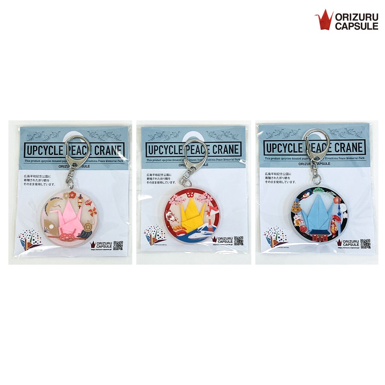 広島平和記念公園に寄贈された折り鶴を、コロナ禍で大量に作られたパーテーションなどを再生したアクリルで閉じ込めたキーホルダーです。エシカルな視点を大切にしながら、環境に配慮した商品として、多くの方に愛されています。こちらのセットはTOKYOイメージと和風デザインの3点セットです。日本折紙協会様よりデザイン監修のご協力をいただいているデザインです。キーホルダーとしての使用はもちろん、カバンやバッグにつけて差別化アイテムとしてお楽しみいただけます。裏面は油性ペンでサインが書けるIDスペースがあります。