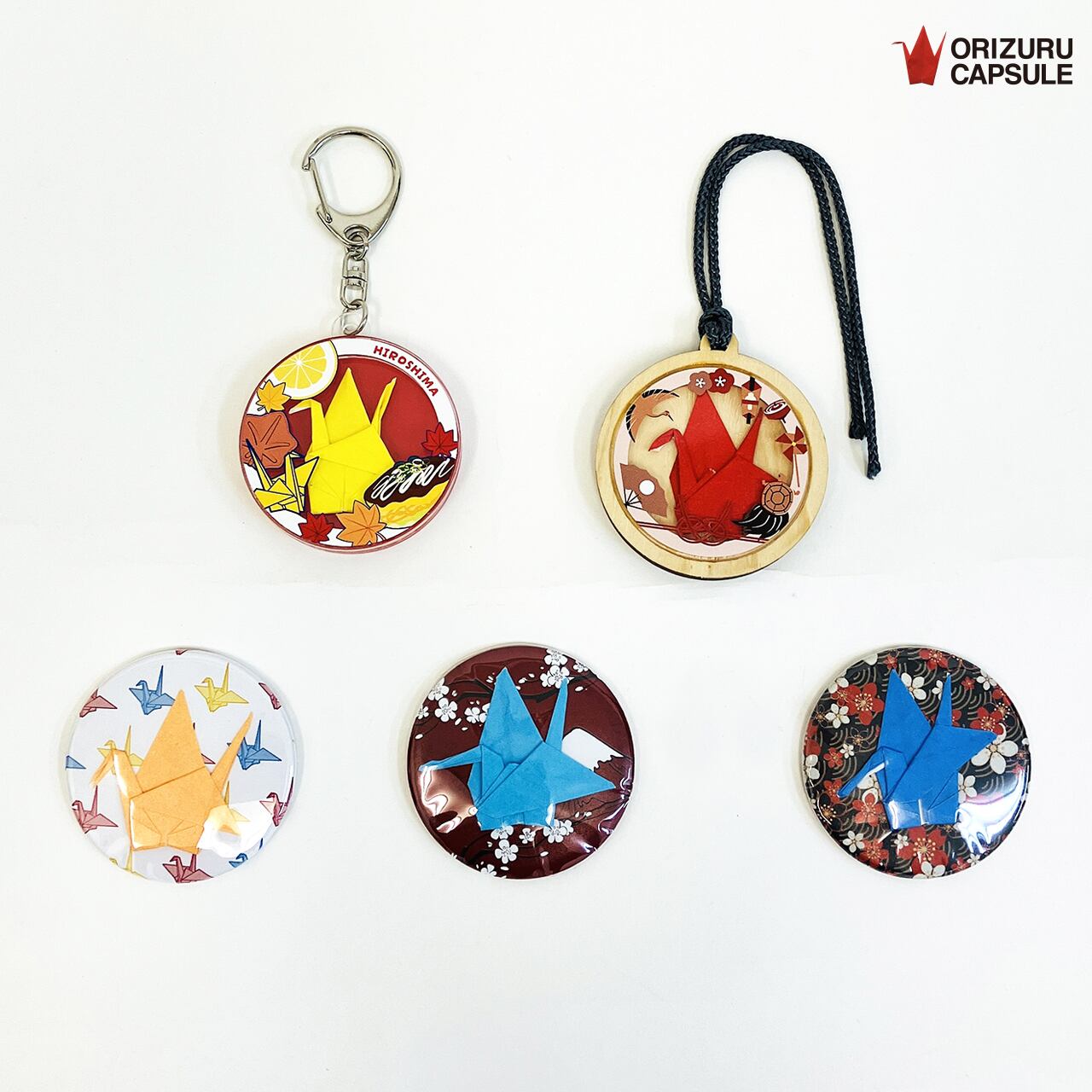 広島平和記念公園に寄贈された折り鶴を、コロナ禍で大量に作られたパーテーションなどを再生したアクリルで閉じ込めたキーホルダーや木製ラゲッジタグ、缶バッジ(ピン&マグネット)です。エシカルな視点を大切にしながら、環境に配慮した商品として、多くの方に愛されています。こちらのセットは実際にガチャの中に入っているコンテンツをランダムに選んだ5点セットです。キーホルダーなどとしての使用はもちろん、カバンやバッグにつけて差別化アイテムとしてお楽しみいただけます。